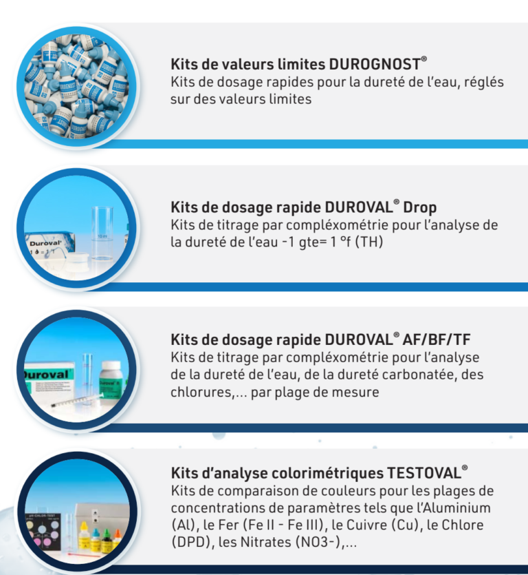 Nos trousses DUROVAL® , DUROGNOST® et TESTOVAL® sont utilisables pour toutes les applications dans le domaine du traitement de l’eau industriel, des piscines, de l’eau potable ou non potable et de l’eau des services de dialyse et dans les hôpitaux.